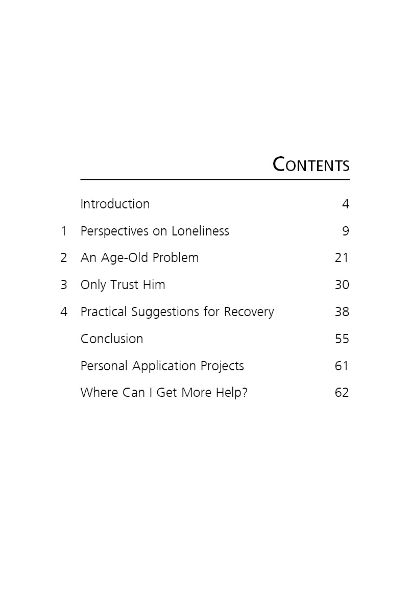 Loneliness is a universal condition. It touches people of any race, religion, gender, nationality, age, social standing, or financial status. If we live long enough, all of us will experience it at some point. Christians are certainly not exempt. However, we are not left to find our way in the fog. Instead, the Bible has a surprising number of passages dealing with loneliness. This mini-book directs you to the comfort that is found in God’s Word and the strength and hope that his grace provides.