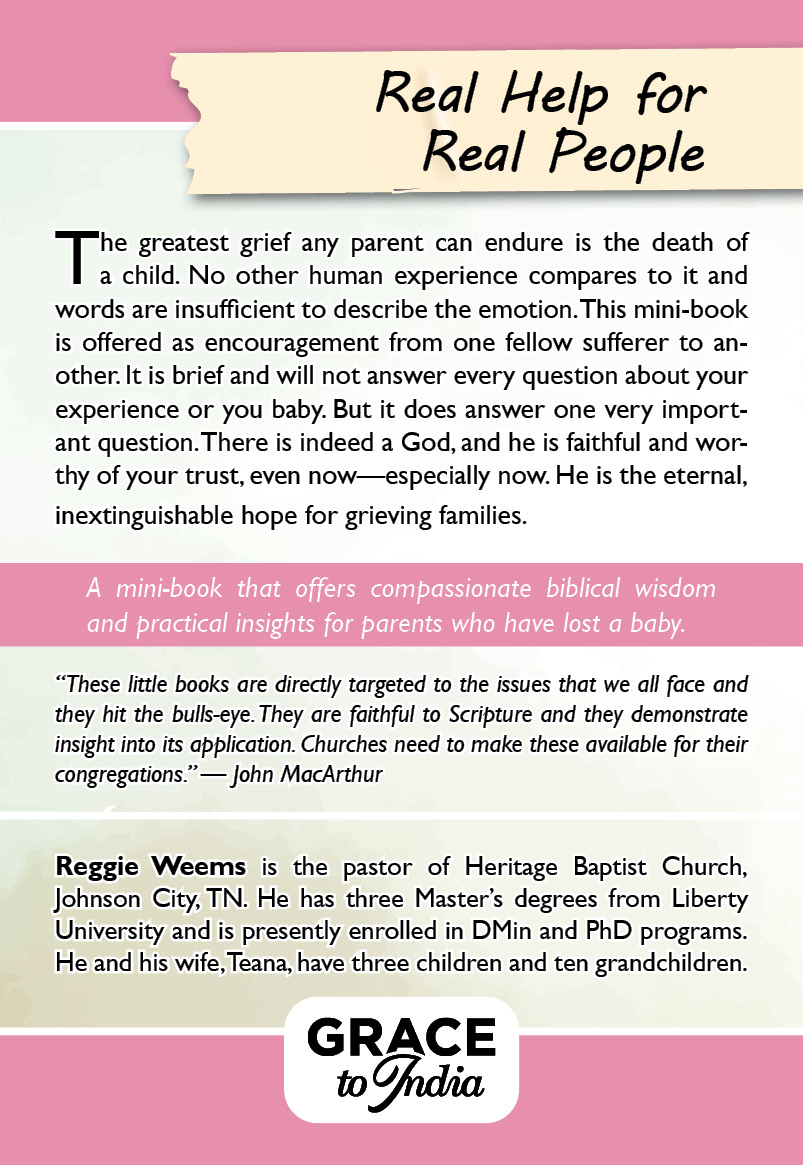 The greatest grief any parent can endure is the death of a child. No other human experience compares to it and words are insufficient to describe the emotion. This mini-book is offered as encouragement from one fellow sufferer to another. It is brief and will not answer every question about your experience or you baby. But it does answer one very important question. There is indeed a God, and he is faithful and worthy of your trust, even now—especially now. He is the eternal, inextinguishable hope for grieving families.